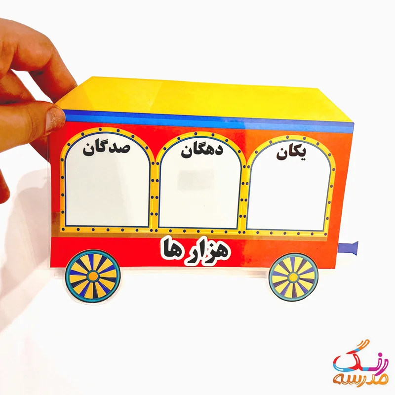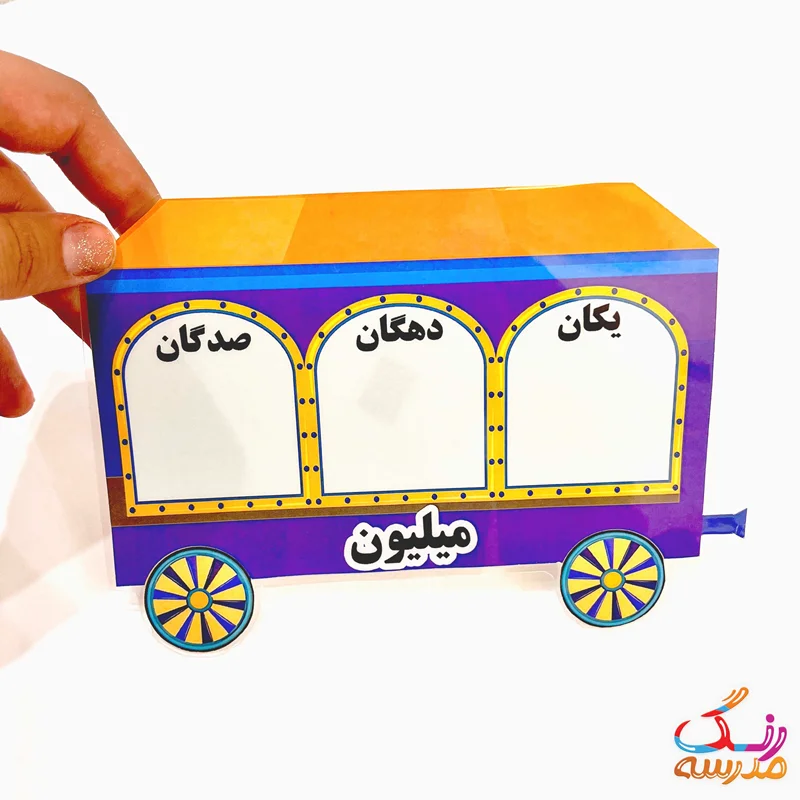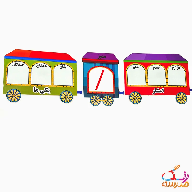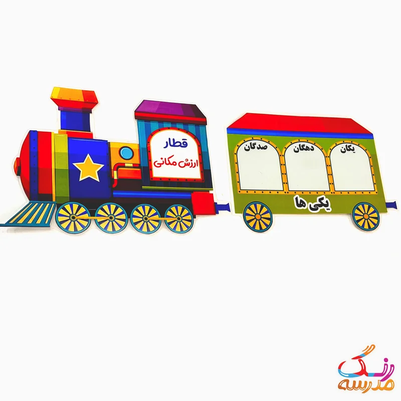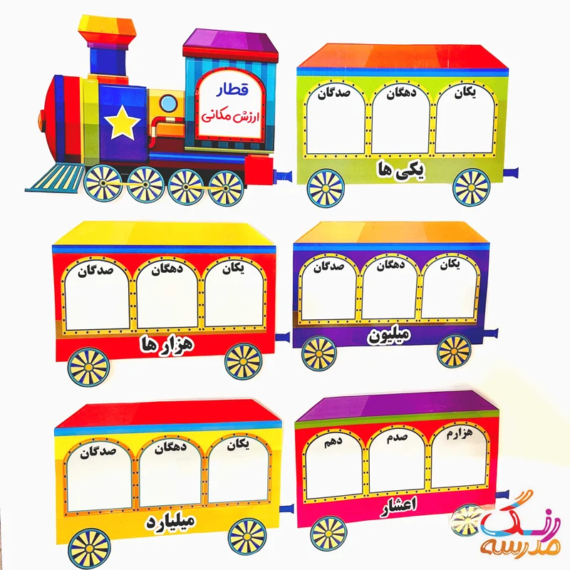 قطار ارزش مکانی رنگ مدرسه از چند واگن تشکیل شده : واگن عنوان،واگن یک ها ، واگن هزارتایی ها،واگن میلیون ،میلیارد،اعشار و ممیز. همه ی واگن ها مگنتی هستند.